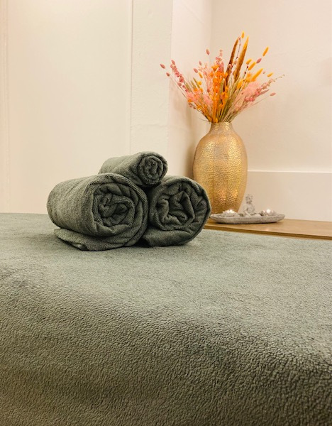 Tijdens de massage lig je op en onder de allerzachtste grote badlakens en op een bijzonder prettige en stabiele massagetafel met een dikke drukverlagende schuimlaag.